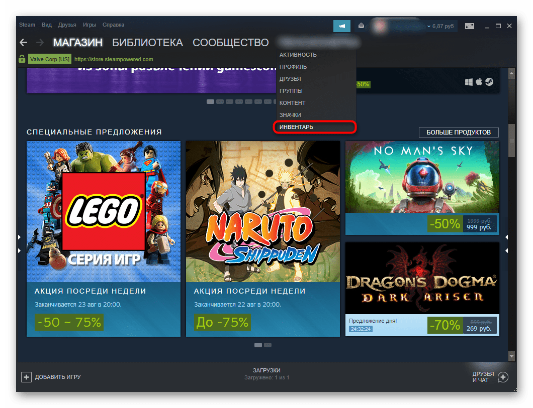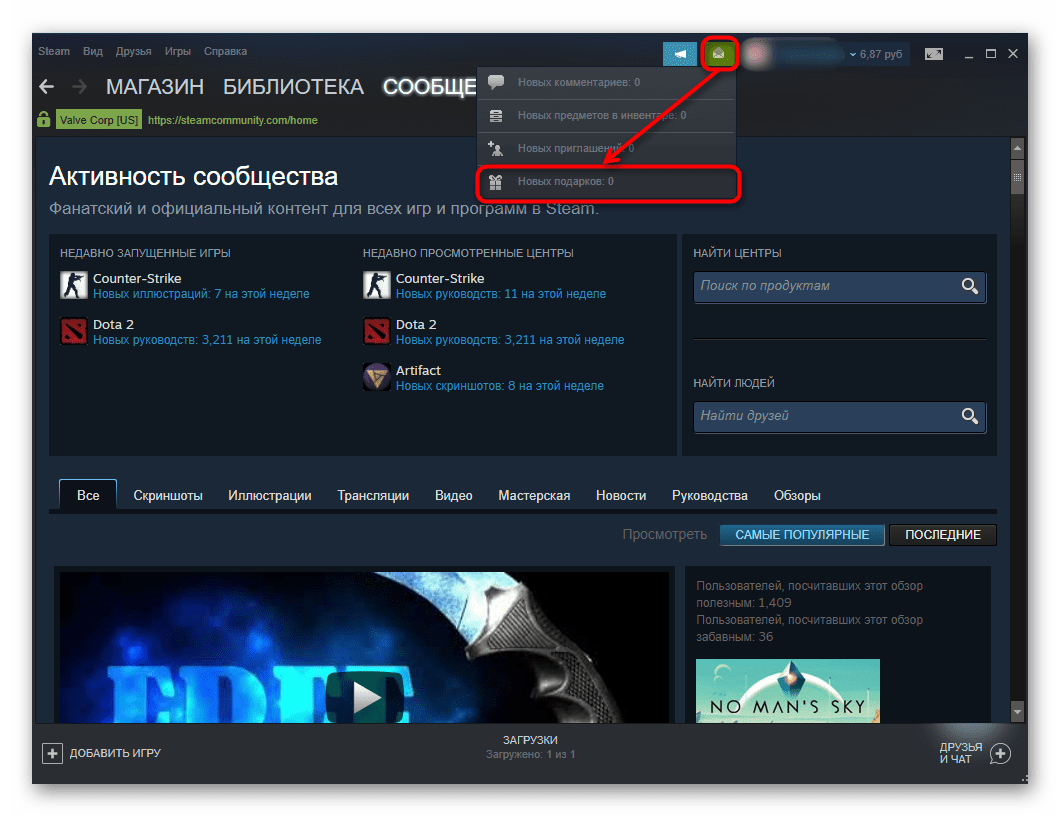 Вы можете просмотреть оповещение, кликнув по «Новые подарки: 1» или зайдя в «Инвентарь» и переключившись на вкладку «Steam».