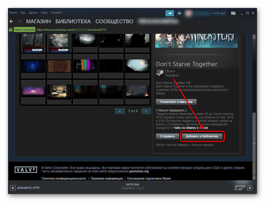 После того как вы перейдете на страницу инвентаря, откройте вкладку Steam, где содержатся все подаренные вам игры, найдите требуемую игру среди предметов инвентаря в Стиме, а затем кликните по ней левой клавишей мыши. Посмотрите в правую колонку, в которой отображена краткая информация об игре. Здесь находится кнопка «добавить в библиотеку», нажмите ее.