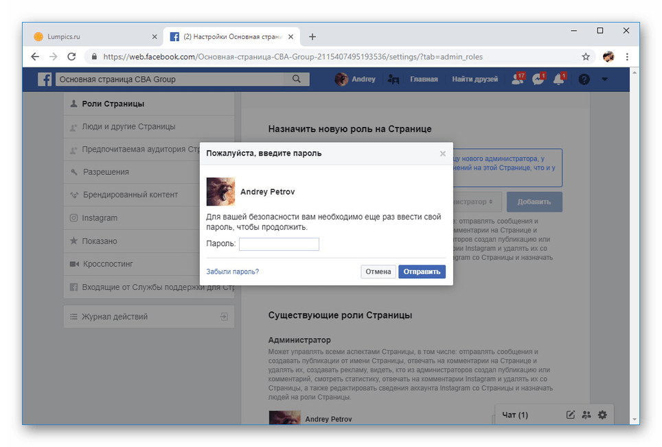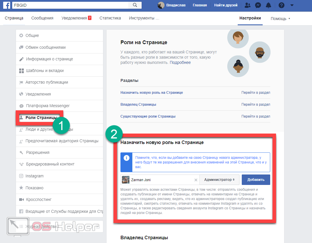 Инструкция для добавления администратора у страниц выглядит следующим образом:
