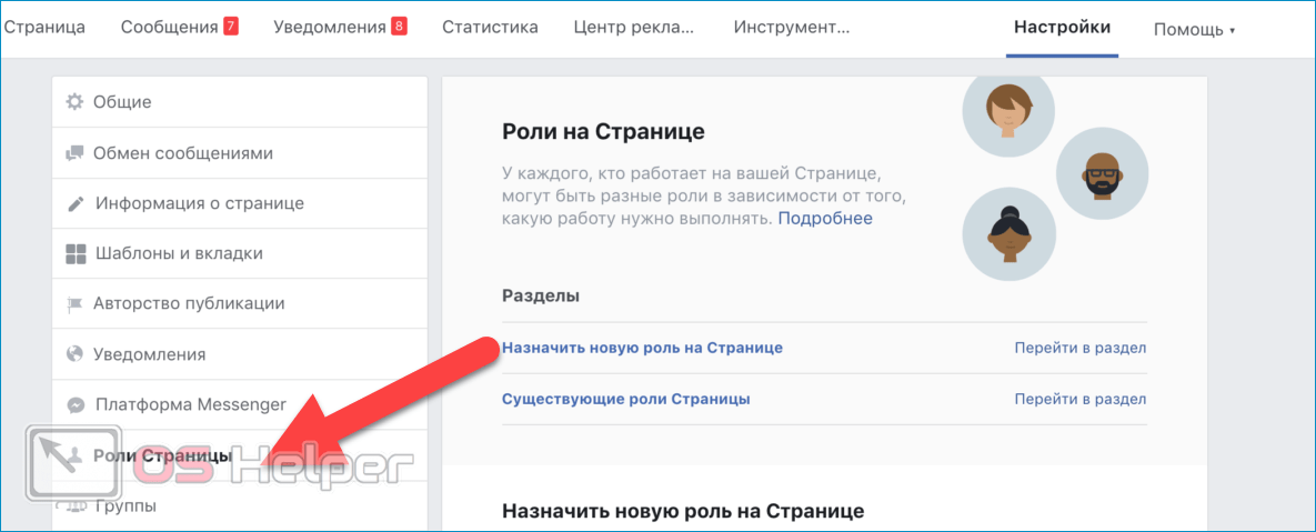 - Через меню в левой части экрана переключитесь на вкладку «Роли Страницы». Здесь находятся инструменты для выбора должностей и отправки приглашений.
