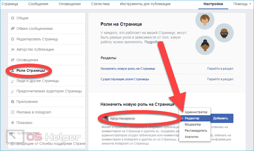 - В рамках блока «Назначить новую роль на Странице» кликните по кнопке «Редактор». Из выпадающего списка следует выбрать «Администратор» или другую подходящую роль.