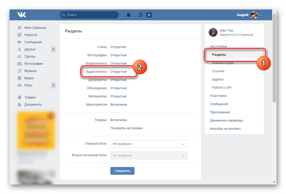 Для того, чтобы приступить к добавлению аудиозаписей в паблик ВКонтакте, сначала потребуется активировать соответствующий раздел через настройки. Процедура полностью идентична как для «Группы», так и «Публичной страницы».