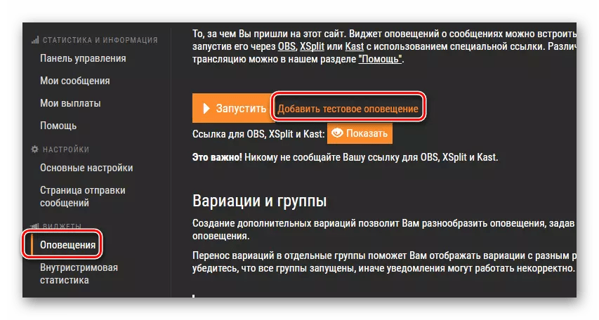 Аэртс для пожертвований имеет различные вкладки. Вы можете познакомиться с ними в процессе использования потоковой службы. Чтобы настроить пожертвование, необходимо посетить раздел «Уведомления» на сайте Donation Alerts.