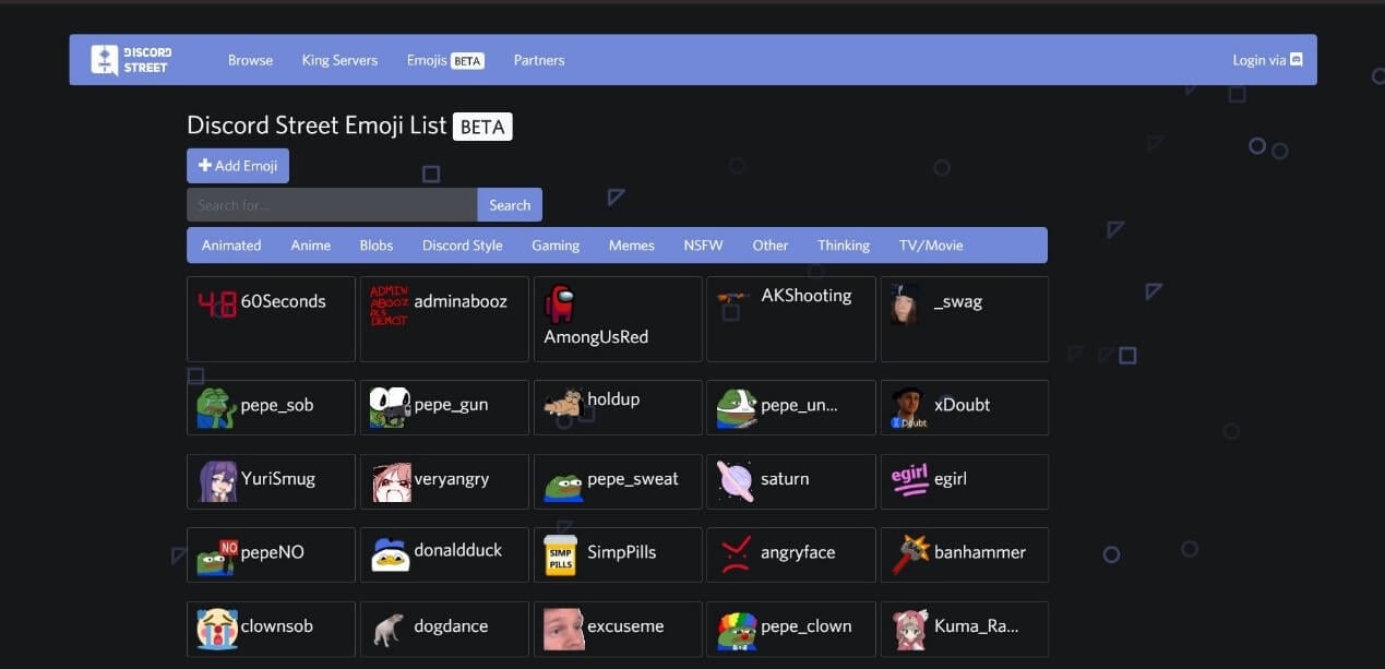 У них есть огромная база данных анимированных смайликов Discord, перечисленных в алфавитном порядке. Пользовательский интерфейс веб-сайта упрощает навигацию, поэтому вы можете найти идеальный смайлик из тысяч смайликов в их базе данных.