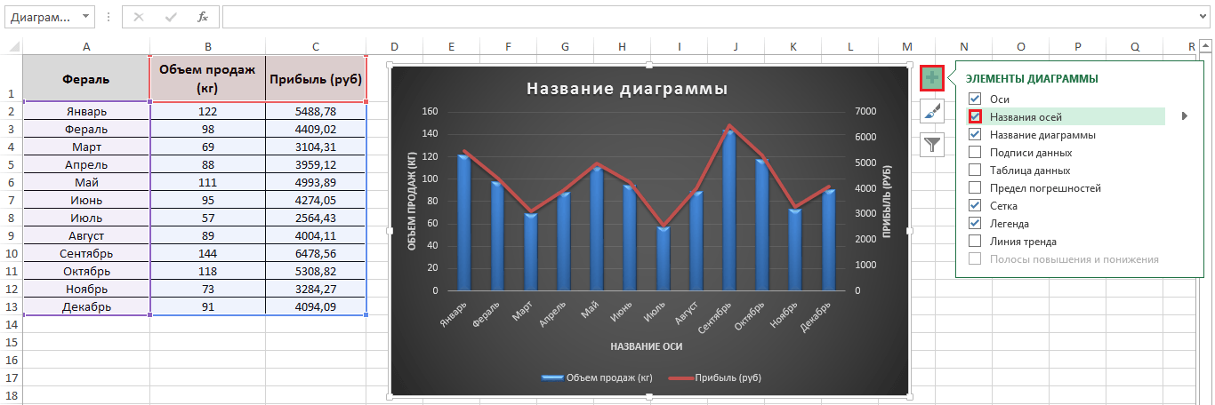 Чтобы комбинированная диаграмма в таблице Excel была максимально понятной, пропишем названия осей. Для этого сначала нажимаем знак «Плюс» справа от графика. Ставим отметку напротив строки «Названия осей» и меняем заголовки таким образом, чтобы было понятно, какой тип данных они отображают.