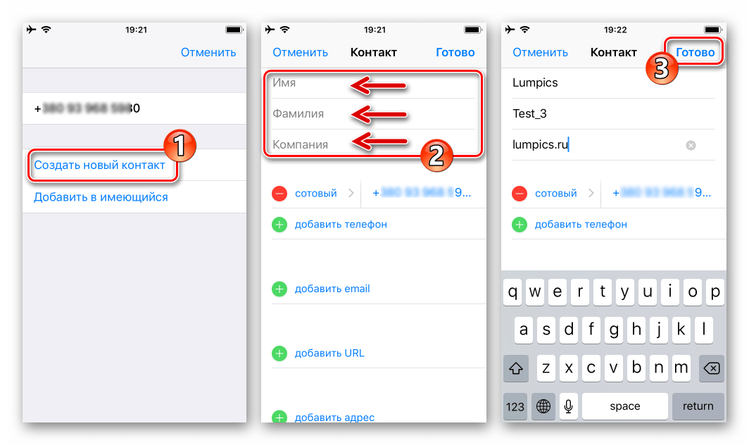 Далее выбираем «Создать новый контакт», заполняем поля «Имя», «Фамилия», «Компания» и тапаем «Готово».