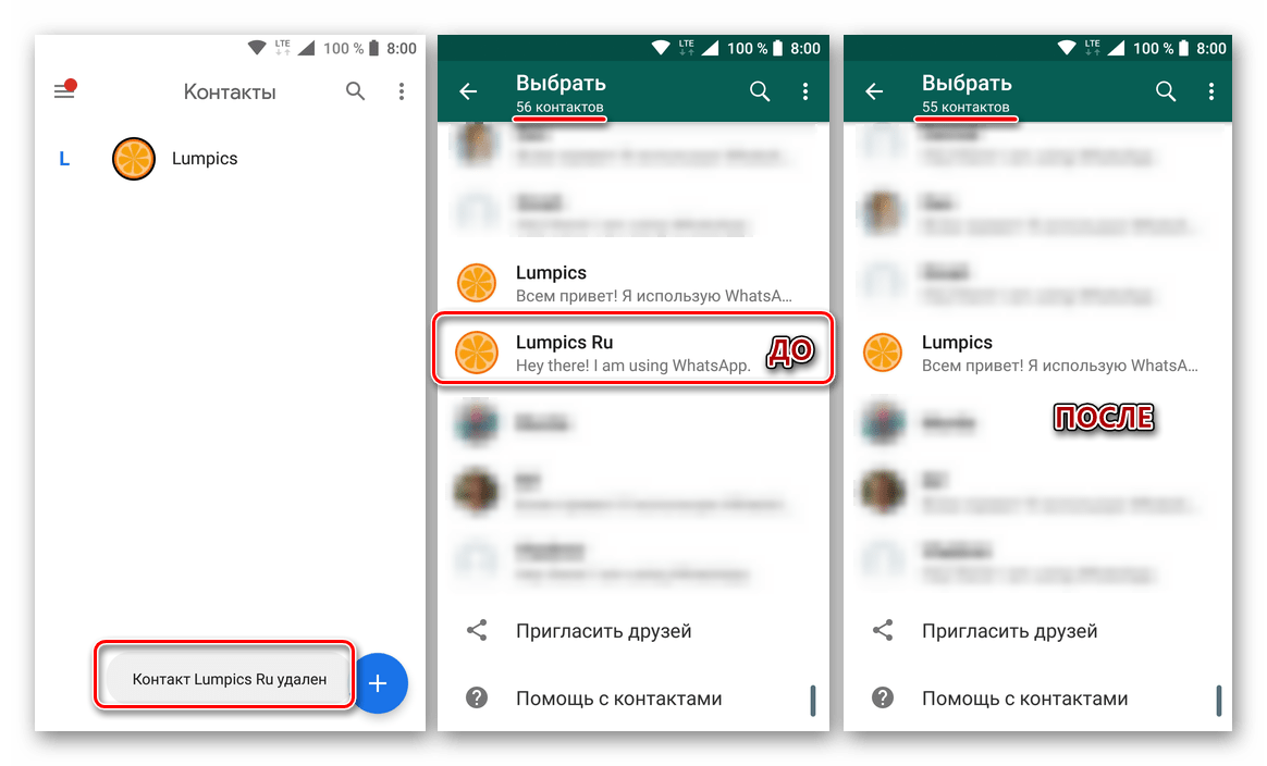 - Контакт будет удален из адресной книги вашего телефона и, следовательно, приложения WhatsApp.