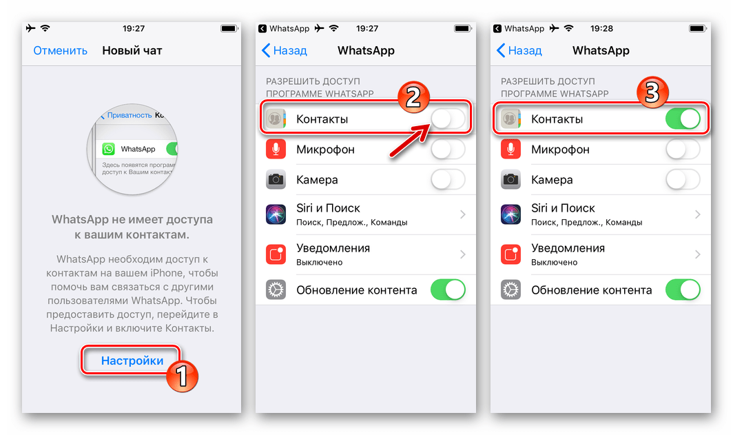 Для исправления ситуации тапаем «Настройки» на экране, отображаемом ВатсАпом. В открывшемся перечне опций переводим переключатель «Контакты» в положение «Включено». Переходим в мессенджер – теперь список записей отображается.