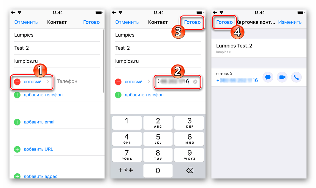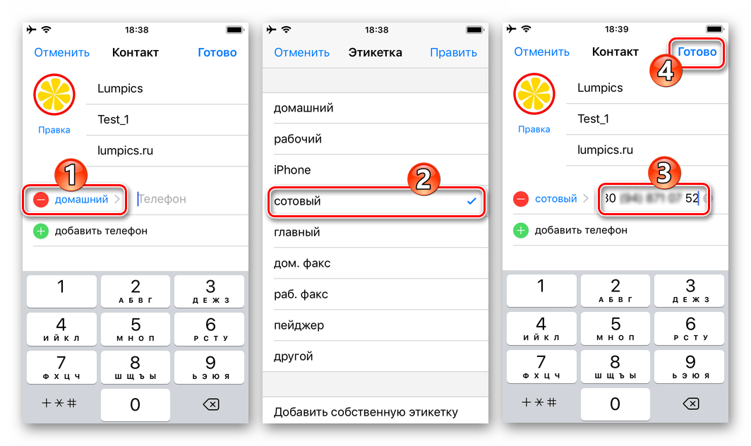 Меняем по желанию тип номера, вносим его в поле «Телефон», и затем дважды касаемся «Готово» вверху экрана.