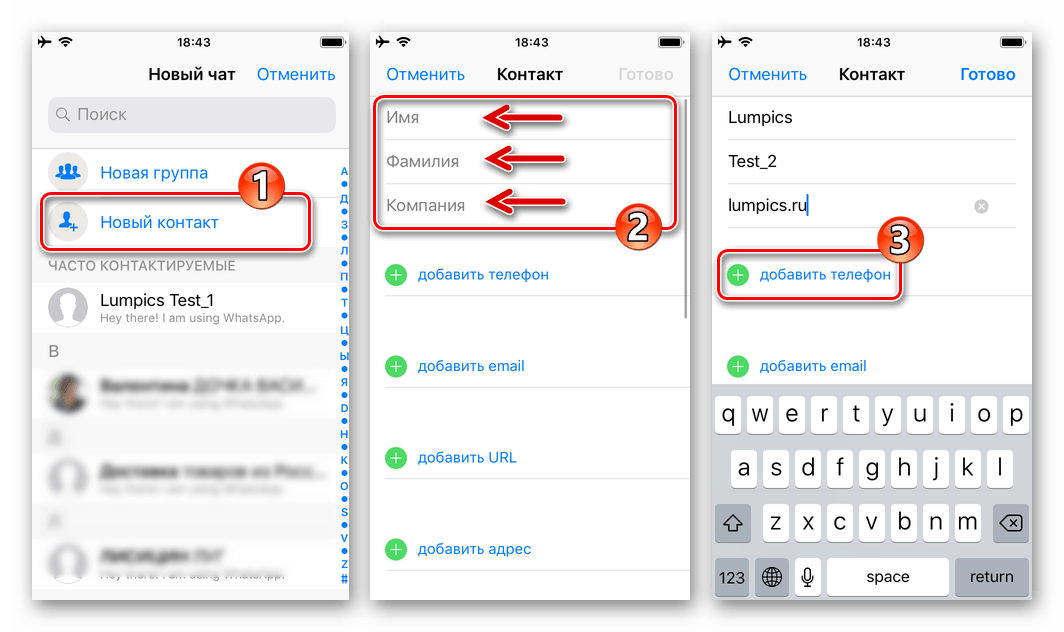 Заполняем поля «Имя», «Фамилия», «Компания», по желанию загружаем фото будущего собеседника. Тапаем «добавить телефон».