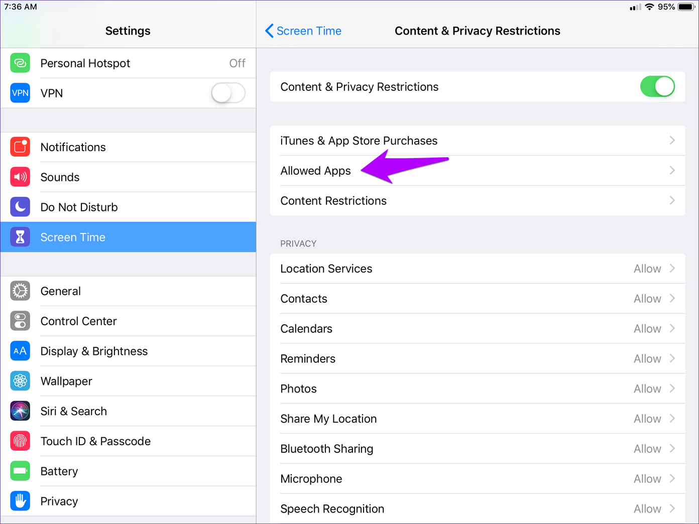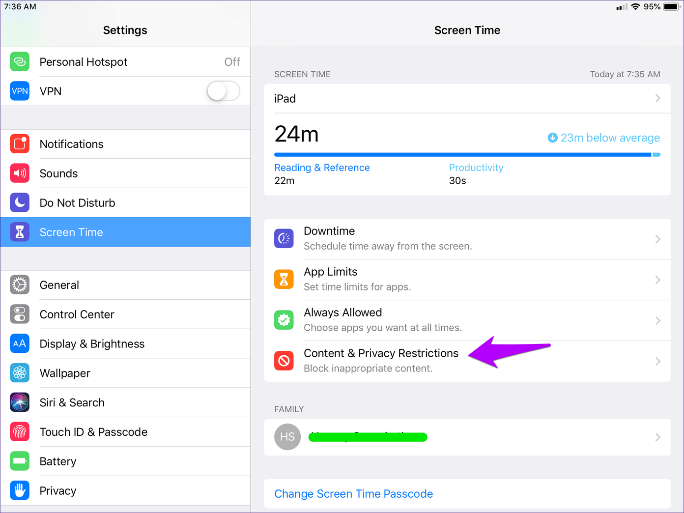 Шаг 1. В приложении «Настройки» нажмите «Время экрана», а затем нажмите «Ограничения содержимого и конфиденциальности».