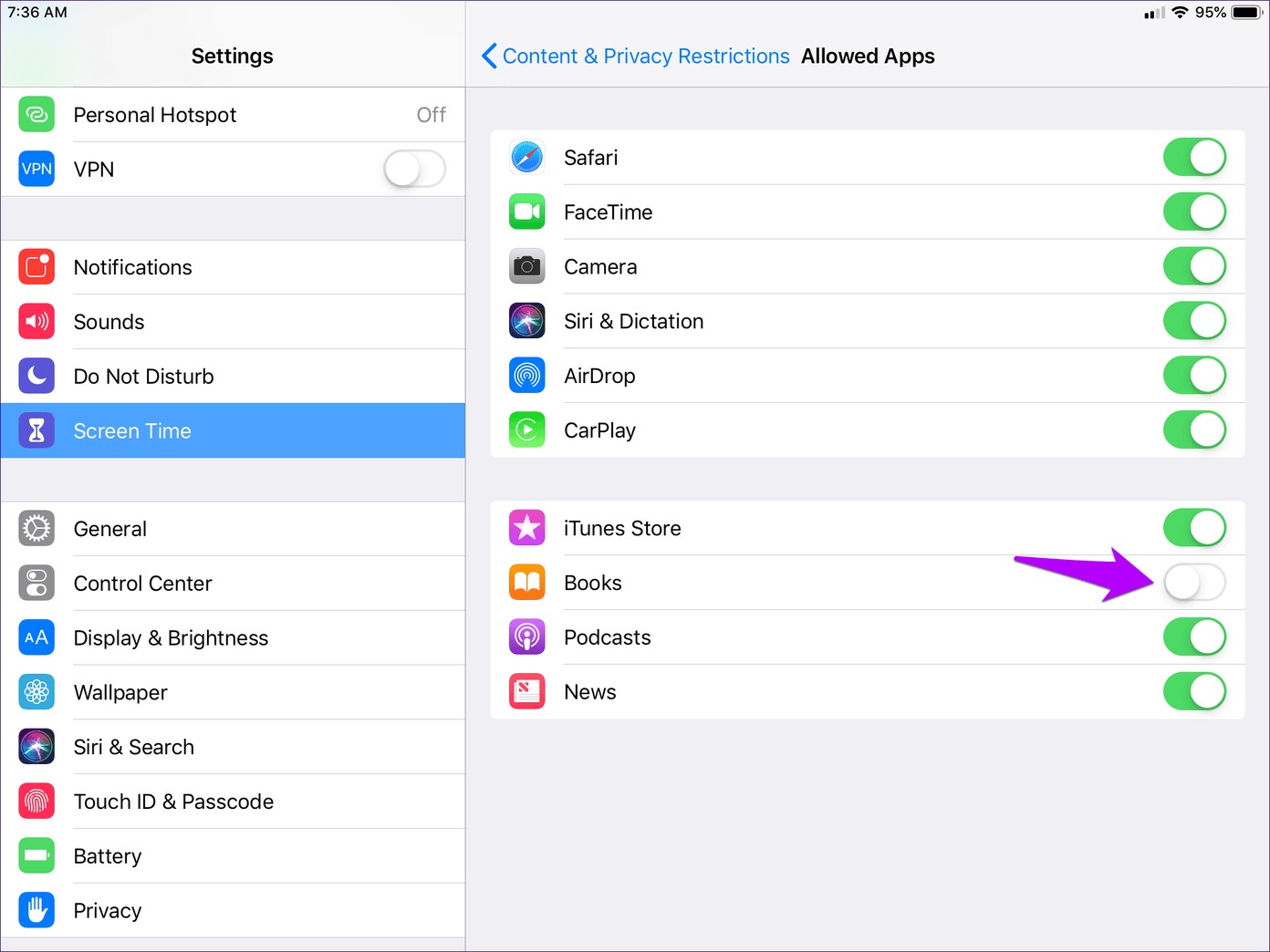 Чтобы позднее включить Книжный магазин, вернитесь к экрану «Разрешенные приложения» в «Экранном времени», а затем включите переключатель рядом с «Книги».