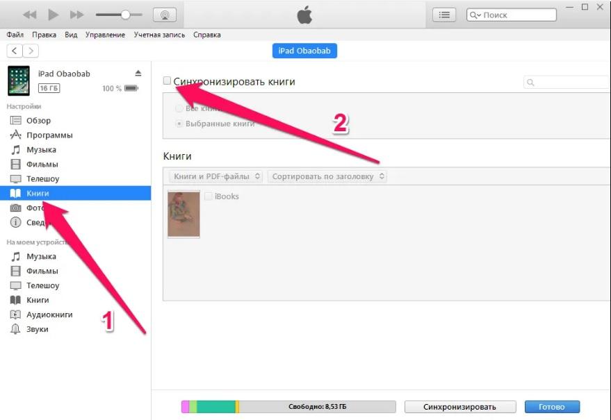 После успешного подключения нажмите «Устройство»> «Книги»> «iBooks»