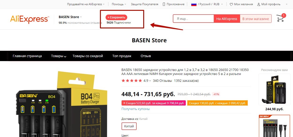- Найдя товар нужного продавца, можно нажать на сам заказ, тогда откроется его страница. На этой странице вверху будет представлена некоторая информация о магазине: его название, процент положительных отзывов, также там имеется и кнопка «Сохранить». После ее нажатия, магазин будет добавлен в список ваших любимых магазинов. Кстати, под этой кнопкой имеется счетчик подписчиков — тех людей, которые, как и вы, добавили данный магазин в любимые.