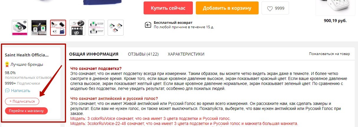 Со страницы товара – чтобы найти кнопку подписаться вам нужно пролистать страницу вниз. Сразу под разделом “Вопросы и ответы” вы найдете информацию о магазине и нужную кнопку.
