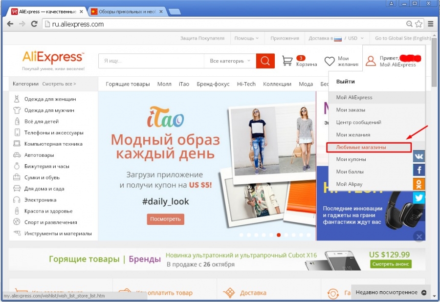 Перейти в раздел “Любимые магазины” можно с любой страницы Aliexpress, с помощью выпадающего меню или из раздела “Мой Aliexpress“.
