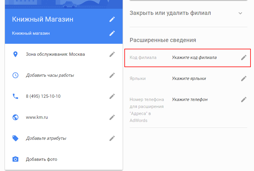 Филиалы можно группировать с помощью опции «Ярлыки». Ярлык, как и код филиала, можно добавить в поле «Расширенные сведения». Каждому филиалу можно присвоить до десяти ярлыков. Ярлыки нужны для поиска адресов в интерфейсе Моего Бизнеса и сортировки расширений «Адреса» в AdWords.