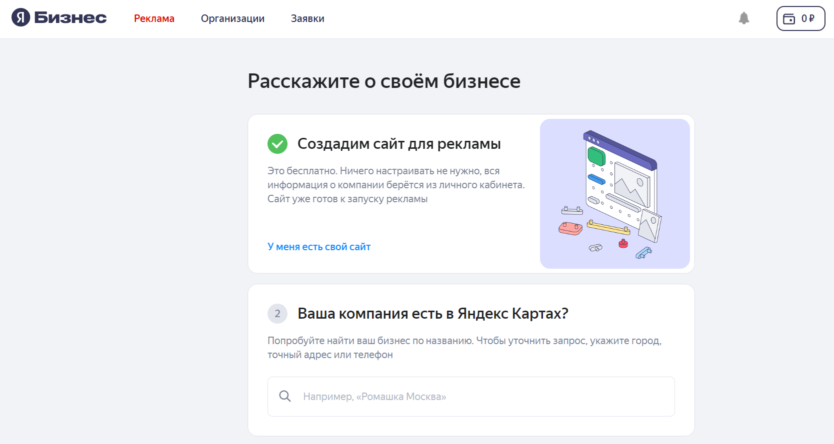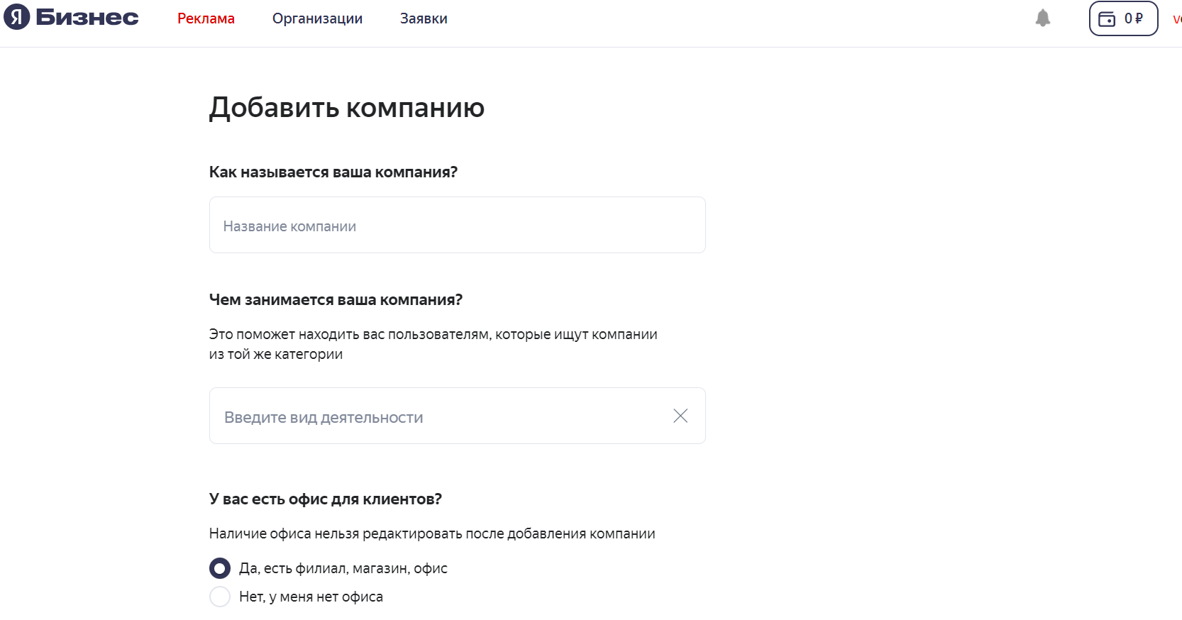 - Если за вами не закреплена ни одна существующая компания, будет сразу же предложено создать новую.