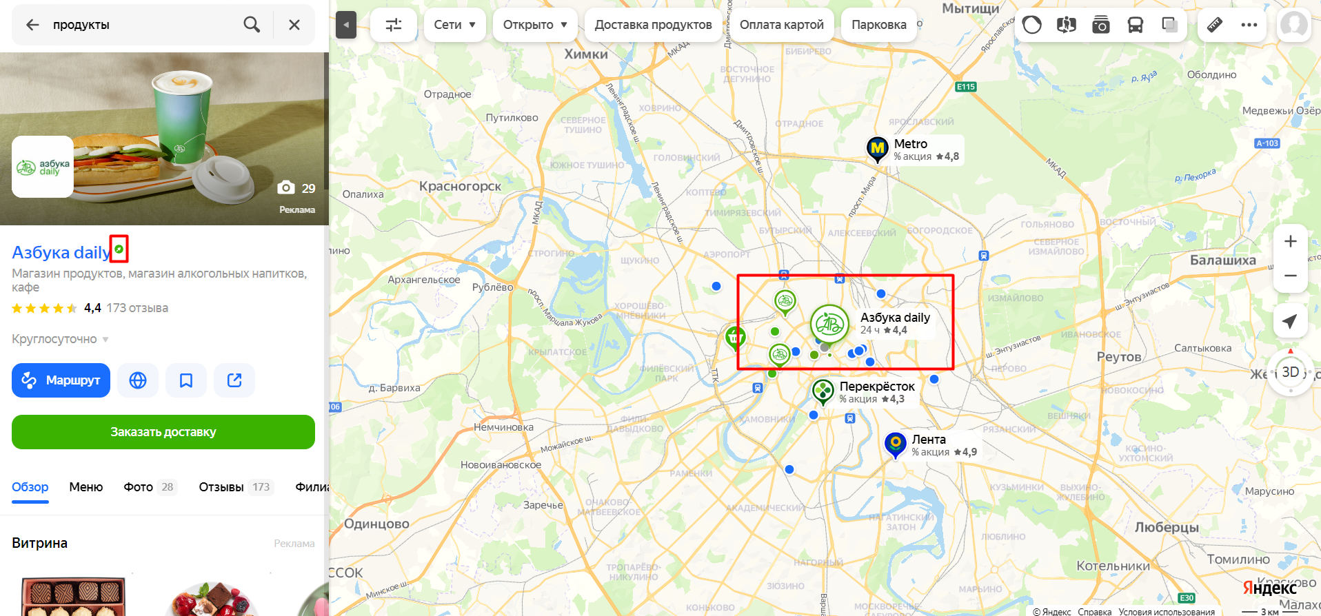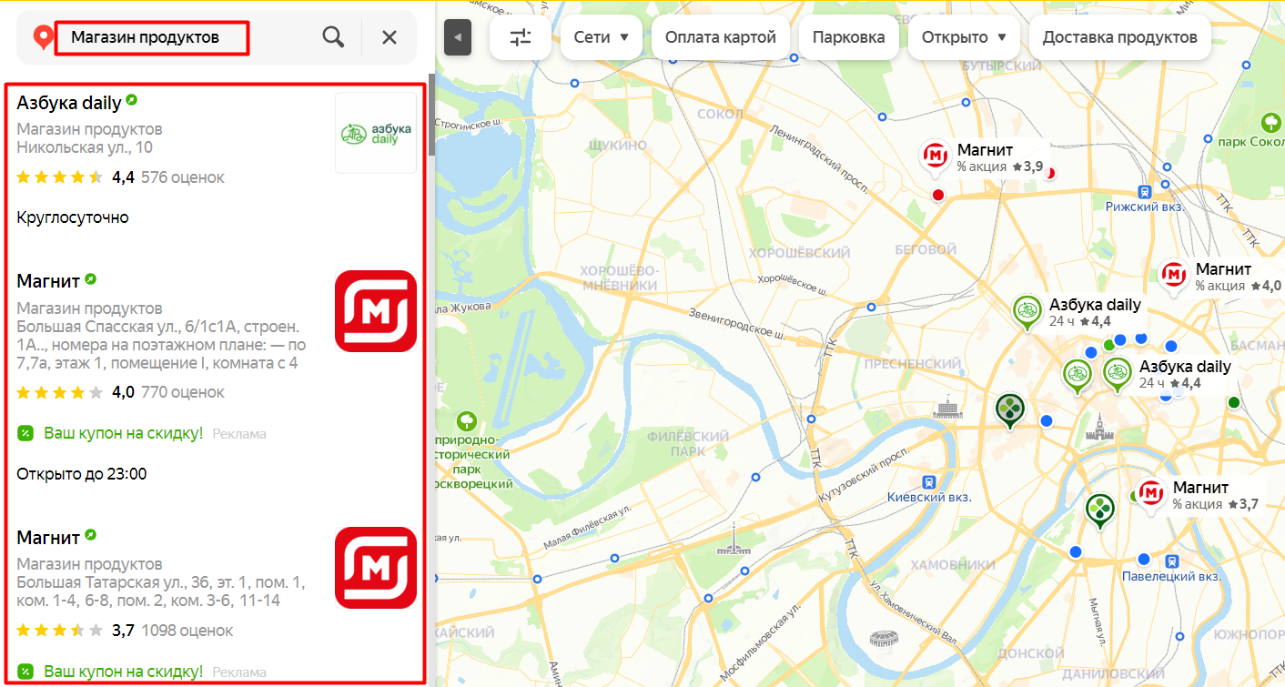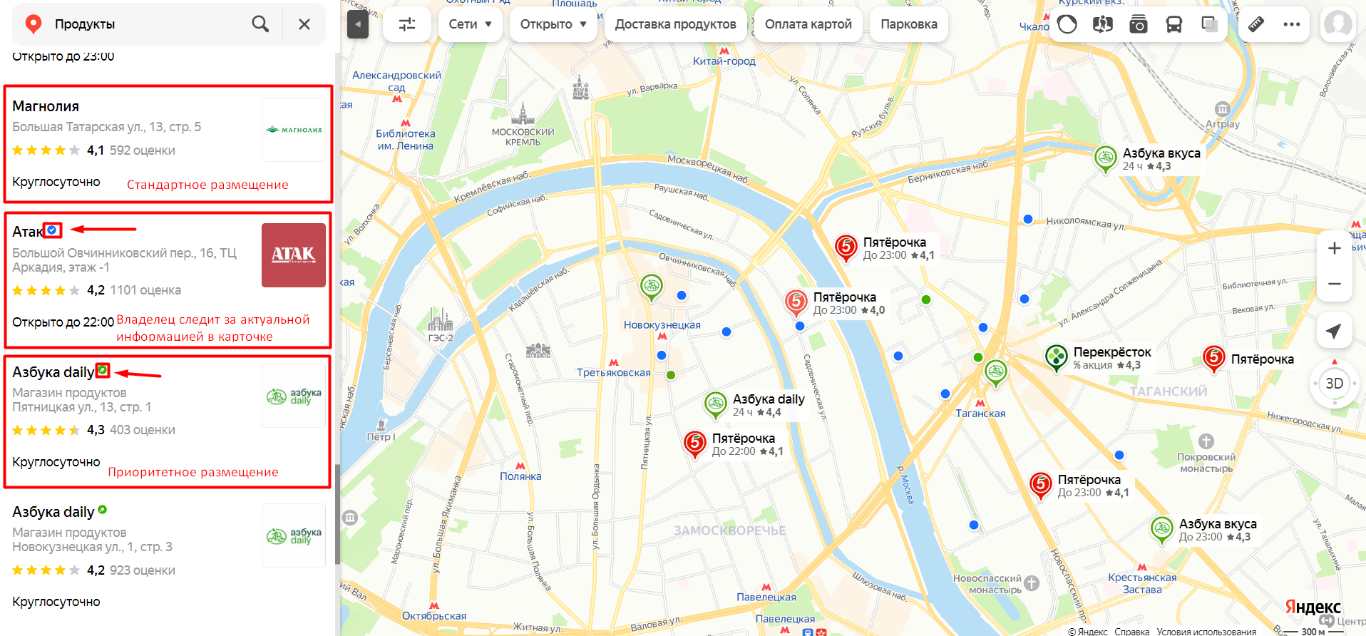 Приоритетная выдача в результатах поиска. Такие компании выпадают на первых местах в поиске. То есть, если вы продаете цветы и пользователь введет в картах «цветочный», ваш магазин будет одним из первых в выдаче.