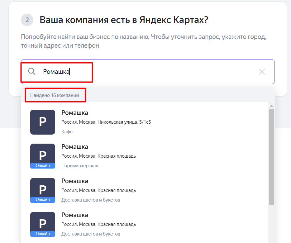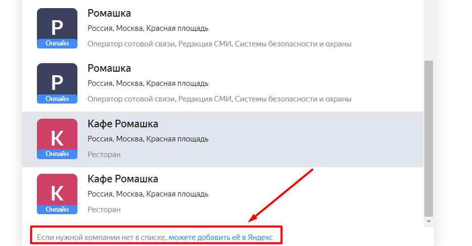 Если ввести название организации, вы увидите список компаний, которые уже есть в Картах с таким же названием.