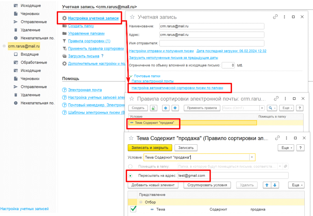 Также в системе 1С:CRM изменяются стандартные папки. В настройках учетной записи для каждой папки можно установить соответствие папок и переименовать их.