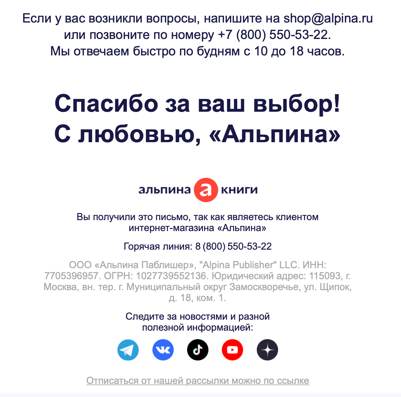 Существуют разные варианты завершения письма. Рассмотрим наиболее полную подпись в почте на примере компании «Альпина».