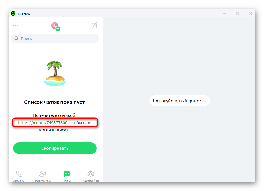 У пользователей программы ICQ есть возможность скопировать ссылку на приглашение через раздел «Чаты». Ее остается отправить другу, которого вы хотите добавить. Как только он перейдет по данной ссылке, сразу сможет написать вам и добавить в контакты. Этот вариант подойдет тем пользователям, кто не знает никнейма пользователя и его номер телефона.