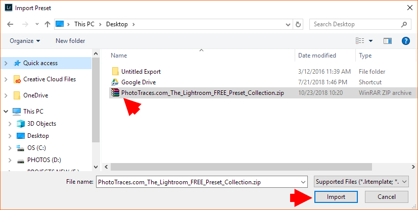 3. Navigate to the location on your computer where you saved the zipped file with the presets, select it and click the Import button.