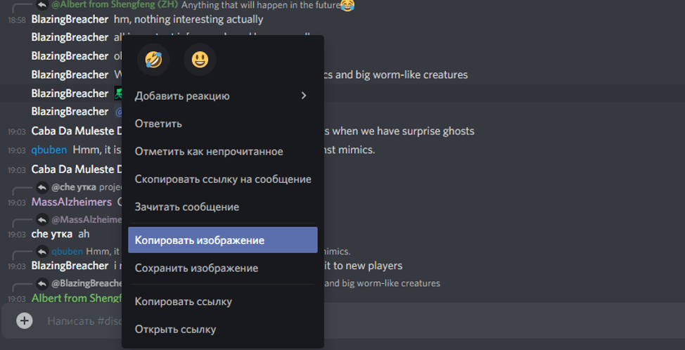 Смайлы можно использовать в качестве реакций на сообщения пользователей. Для этого не обязательно отправлять отдельную картинку. Достаточно навести курсор на то, что отправил участник чата и нажать на изображение смайла с плюсиком вверху, которое находится справой стороны от сообщения. Затем из списка картинок выбрать нужную. В итоге под текстом пользователя появится выбранное эмодзи.
