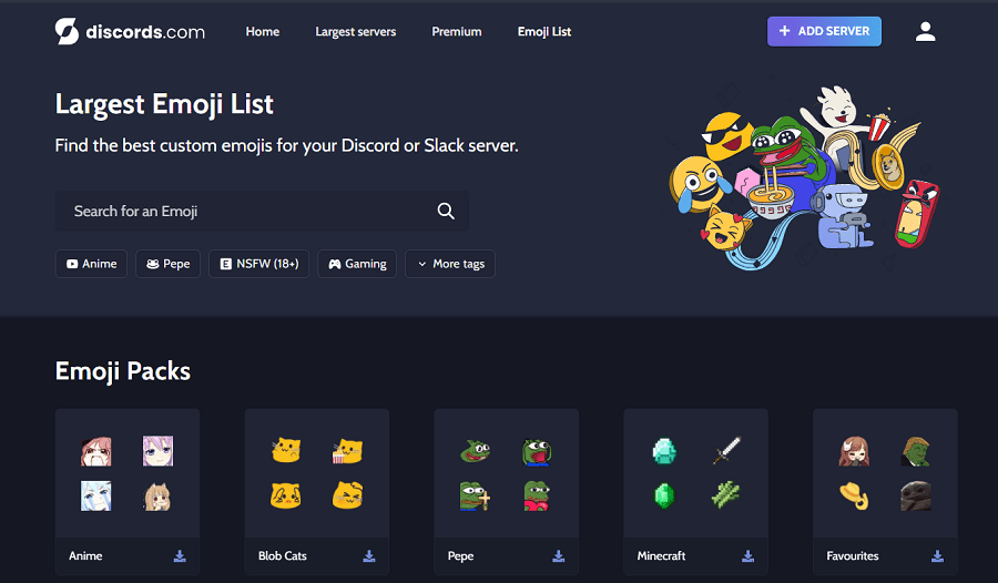 - Slackmoji. Неофициальный каталог с настраиваемыми, созданными вручную и постоянно обновляемыми смайликами для Discord. Представленный онлайн более 3 лет, он содержит уникальную подборку эмоций на любой случай. Предлагает сортировку по теме, доступ к строке поиска и специальные тематические подборки. С поиском и скачиванием проблем не возникнет даже у требовательных владельцев сервера Discord — слишком много контента.