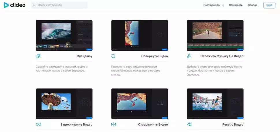 1. Перейдите на главную страницу Clideo и нажмите «Все инструменты». В списке функций найдите «Наложить музыку на видео».