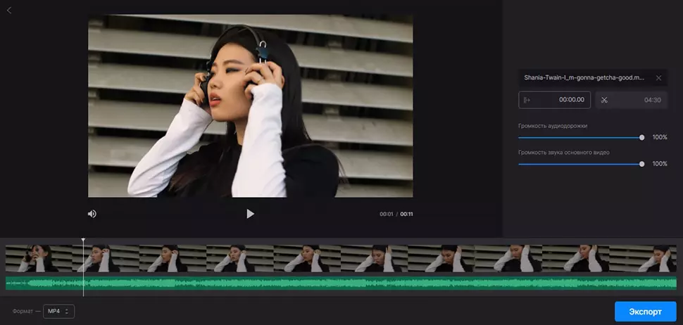 4. Загруженная дорожка автоматически будет проигрываться с начала видео, но вы можете это изменить, задав время ее появления. Также вы можете снизить громкость основной звуковой дорожки до нуля, тем самым полностью заменив ее на новую. Когда результат вас устроит, раскройте список форматов в нижней части экрана, установите нужный вариант и нажмите «Экспорт».
