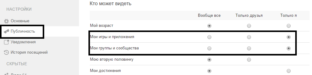 Затем открываем раздел Публичность. Запрещаем: