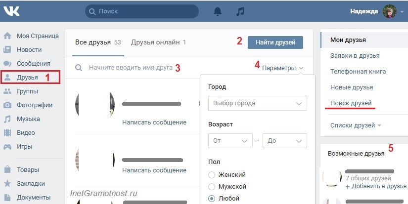 - 5 на рис. 1 – «Возможные друзья», где в первую очередь предлагается добавить тех, у кого есть с Вами общие друзья.