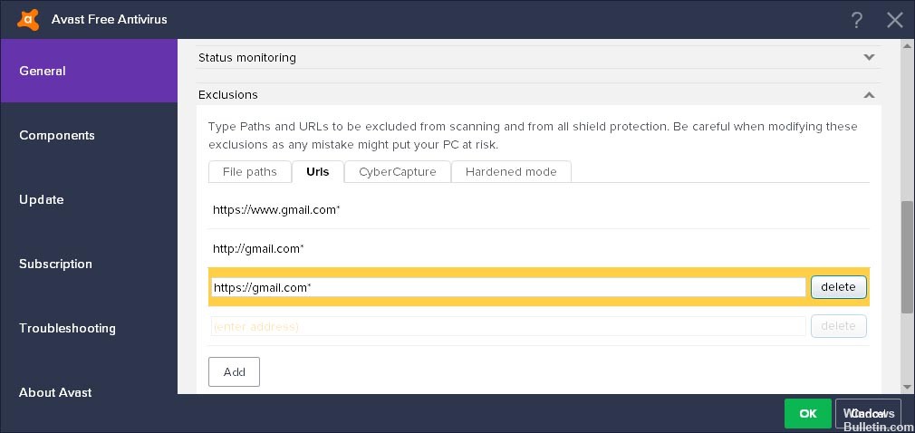 - Avast автоматически добавит «http: //» перед веб-сайтом, поэтому все, что вам нужно сделать, это ввести «sitename.com», чтобы добавить веб-сайт.
