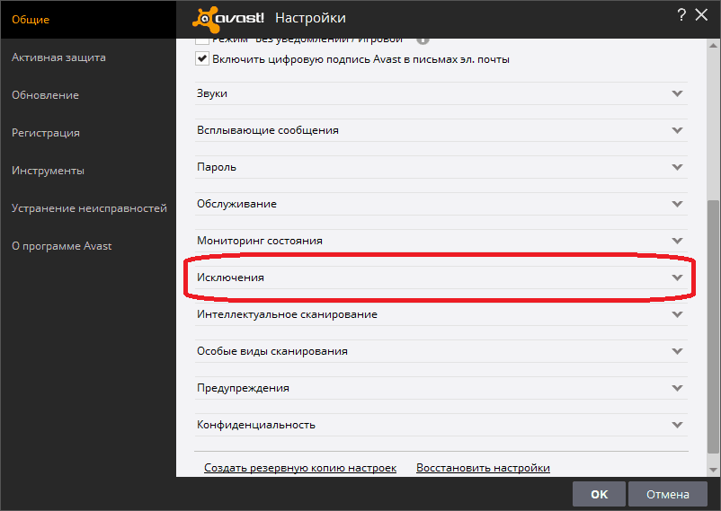 Найдите пункт меню «Исключения» и добавьте элемент, который нужно исключить из сканирования с помощью определенного тега Avast
