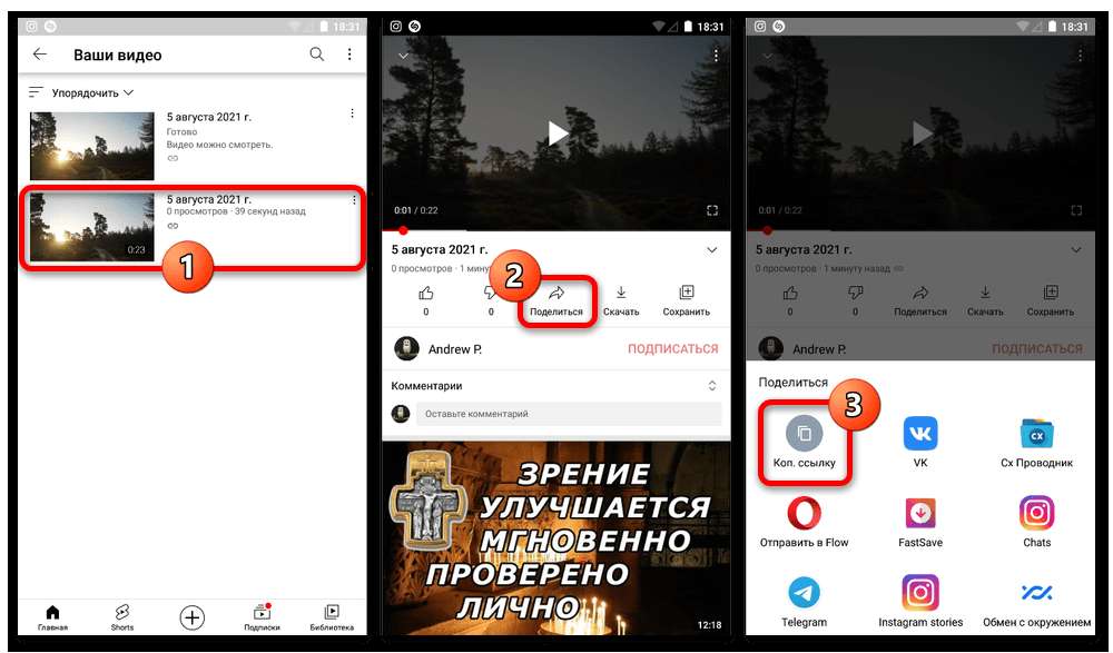 После того как видео будет подготовлено и загружено на YouTube, перейдите на главную страницу плеера и через меню «Поделиться» произведите копирование URL-адреса. В отличие от сайта, где нужно было использовать данные исключительно из адресной строки, здесь вполне достаточно и такого способа.