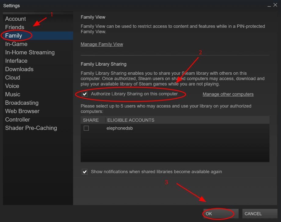 Затем вы должны включить безопасность Steam Guard, и вы можете включить Совместное использование семейной библиотеки в вашем Steam.
