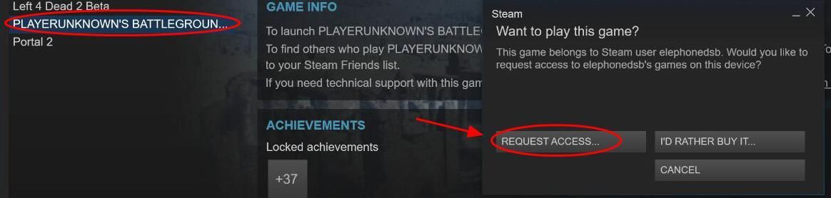 Вы также можете отправить запрос на игру в игры, установленные на компьютере вашего друга, дважды щелкнув установленные игры, в которые вы хотите играть. Например, если вы хотите сыграть в PLAYERUNKNOWN’S BATTLEGROUNDS своего друга, вы можете войти в свою учетную запись Steam на компьютере друга, дважды щелкнуть PUBG и нажать ЗАПРОС ДОСТУПА .