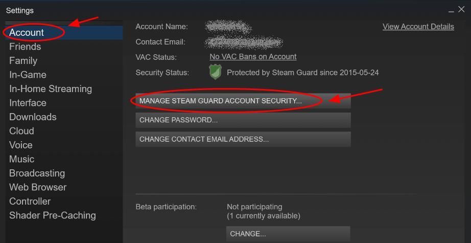 3) Нажмите Счет и щелкните УПРАВЛЕНИЕ БЕЗОПАСНОСТЬЮ УЧЕТНОЙ ЗАПИСИ STEAM GUARD .