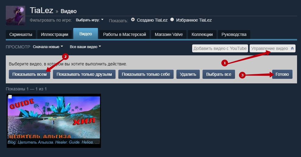 Если изменить доступ к материалу – выключить опцию «Для всех», то ваш материал не будет отображаться в центре сообщества игровой платформы Steam.