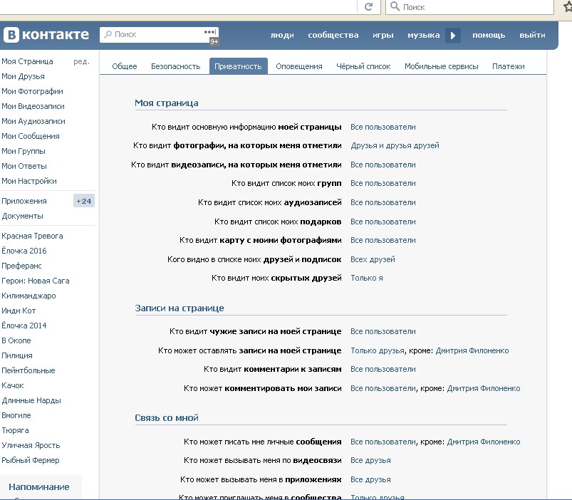 Для примера, покажу, что можно сделать в настройках своей страницы в разделе «приватность».