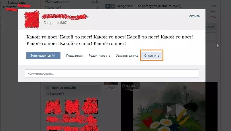 Что касается того, как сделать, чтобы вообще никакой пост не был закреплен, то делается это очень просто – открываем то же самое меню путем нажатия на текст поста или на дату его размещения.