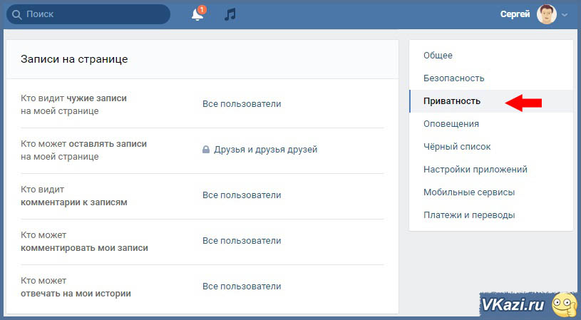 Хочу напомнить, что для того, чтобы ограничить доступ к собственной страничке только одному пользователю ВК, его просто нужно причислить в черному списку и всё. Но что же делать, в случае если мы говорим обо всех юзерах? В такого рода ситуации следует зайти “настройками приватности”. Заходим в свою учетную запись ВК, потом по левую сторону отыскиваем раздел “Мои настройки”, заходим туда. Тут нам понадобиться перейти во вкладку “Приватность”. Во вкладке “Приватность” нас будет интересовать раздел “Записи в странице”.