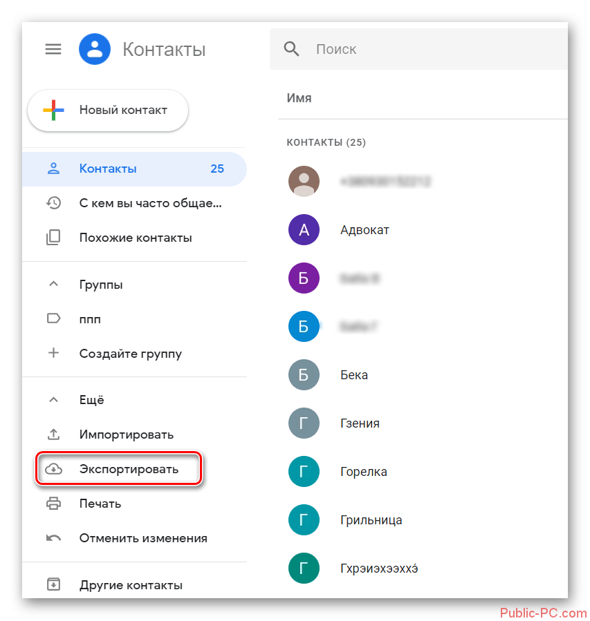 Откроется окошко с настройками экспорта. Здесь вы можете выбрать какие контакты нужно сохранить, а какие нет. Для удобства они могут быть разбиты по группам. Под заголовком «Выберите формат файла для экспорта» рекомендуется установить галочку напротив «Google CSV». Нажмите на кнопку «Экспорт».