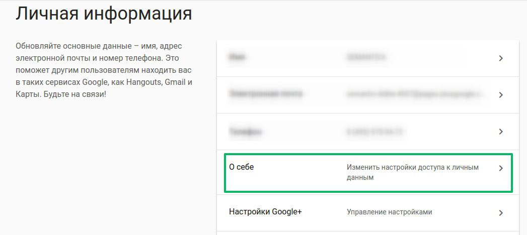 - Ссылки на ресурсы, с которыми связана плюс-страница, находятся в разделе «Личная информация»: