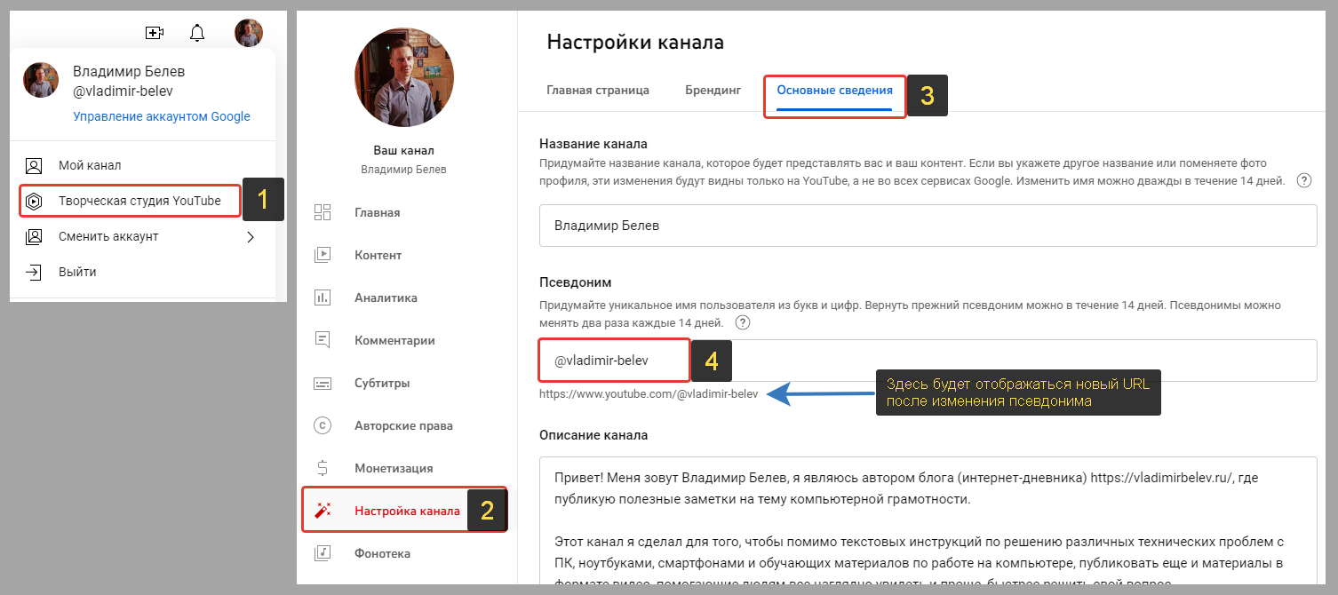 Редактирование псевдонима и адреса канала Youtube через творческую студию