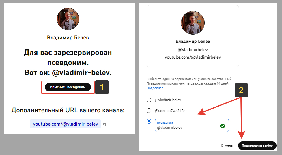 После успешного изменения, автоматически поменяется и URL адрес вашего канала Youtube, отображаемый в этом же окне. Например, у меня получился такой https://youtube.com/@vladimir-belev Коротко, понятно, удобно.