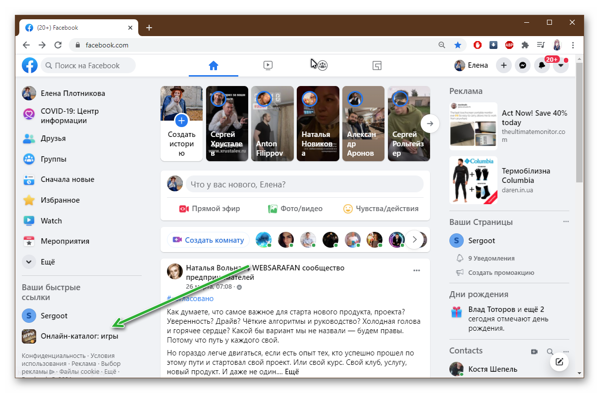 Для начала откройте в браузере страницу FB, с которой предстоит работать. В левой части экрана находится меню. В нем кликните по пункту «Ещё», чтобы просмотреть полный список.