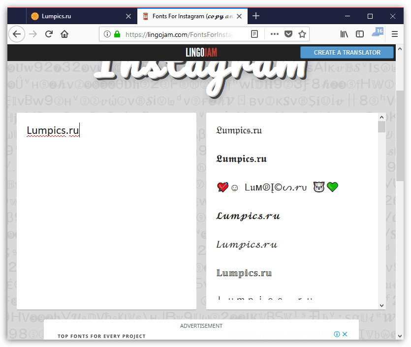 ะั ัะตะบะพะผะตะฝะดัะตะผ ัะตัะฒะธั Instagram Fonts. ะญัะฐ ัััะฐะฝะธัะฐ ะฟะพะทะฒะพะปัะตั ัะฒะธะดะตัั, ะบะฐะบ ะะฐั ัะตะบัั ะฑัะดะตั ะฒัะณะปัะดะตัั ั ะฟัะธะผะตะฝะตะฝะธะตะผ ัะฐะทะฝัั ััะธััะพะฒ, ะฒะบะปััะฐั ะฟะพะปัะถะธัะฝัะน ะธ ะบัััะธะฒ.